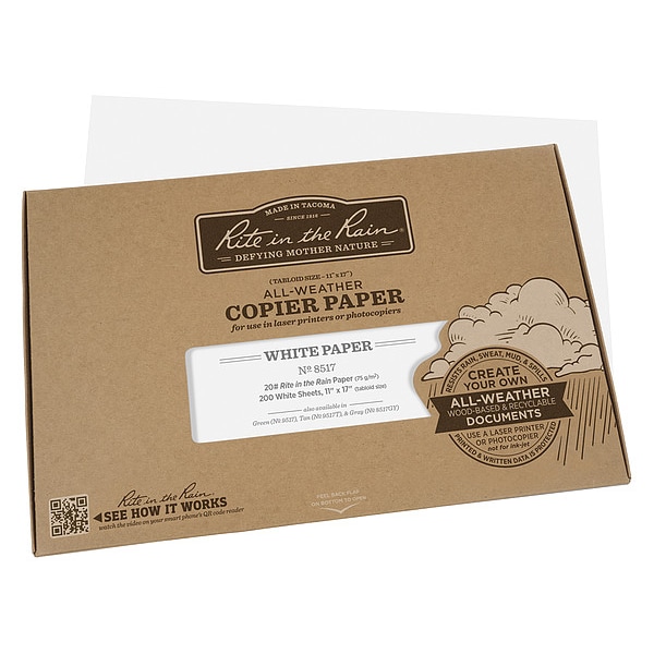 Waterproof Laser Paper, Sheet Size 11 in x 17 in, Paper Size Name Tabloid, Paper Weight 20 lb, Brightness 85, Color White, Finish Glossy, 3 Hole Punch No, Total Number of Sheets 200, Number of Reams per Case 5, For Use With Copiers, Laser Printers, Recycled Content 0 Percent, Package Quantity 200