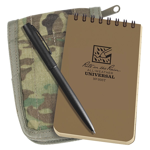 Notebook Kit, Cover Color Tan, Binding Spiral, Number of Sheets 50, Sheet Size 3 in x 5 in, Rule Ruled, Paper Color Tan, Paper Weight 20 lb, Includes Clicker Pen, Cordura Cover