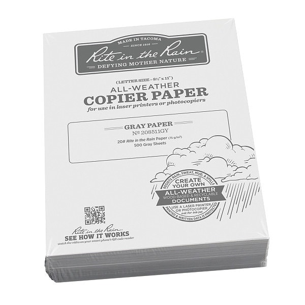 Waterproof Laser Paper, Sheet Size 8 1/2 in x 11 in, Paper Size Name Letter, Paper Weight 20 lb, Color Gray, Finish Water-Resistant, 3 Hole Punch No, Total Number of Sheets 500, Number of Reams per Case 10, For Use With Copiers, Non-inkjet Printers, Package Quantity 500