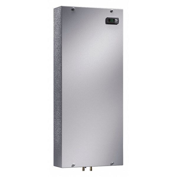 Heat Exchanger, Cooling Capacity 1025 BtuH, Housing Material Carbon Steel, Mounting Wall Mount, Cooling Method Air/Water, NEMA Enclosure Type 12, Height 12.00 in, Width 6.00 in, Depth 3.00 in, Standards UL Type 12, Wiring Method Fully Wired, Amps 0.11/0.13, Hz 50/60, Voltage 230V AC, Phase 1, Housing Color Light Gray, Includes Hardware Mounting Kit, Cut-Out Template At 1:1 Scale