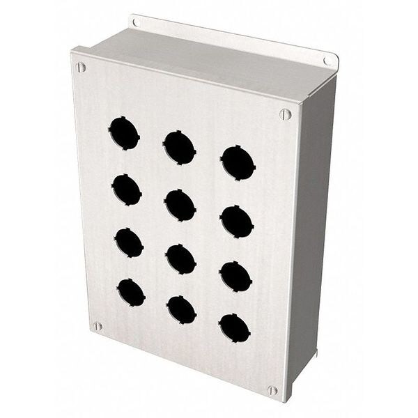 Push Button Enclosure, Number of Columns 3, Number of Holes 12, NEMA Rating 4X, 12, 13, Hole Size 22mm, Material 304 Stainless Steel, Height 10.70 in, Width 6.80 in, Depth 4.25 in, Color Silver, Includes Mounting Flange, Neoprene Gasket, Type Miniature, For Use With 22mm Pushbuttons, Selector Switches, Pilot Lights, Mounting Style External Feet, Standards cUL, UL Listed, UL File No. E118617