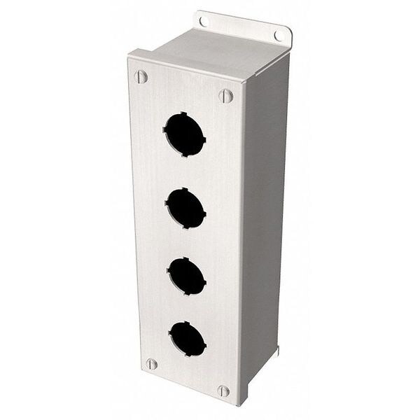 Push Button Enclosure, Number of Columns 1, Number of Holes 4, NEMA Rating 4X, 12, 13, Hole Size 22mm, Material 316L Stainless Steel, Height 9.40 in, Width 3.00 in, Depth 3.50 in, Color Silver, Includes Mounting Flange, Neoprene Gasket, Type Miniature, For Use With 22mm Pushbuttons, Selector Switches, Pilot Lights, Mounting Style External Feet, Standards cUL, UL Listed, UL File No. E118617