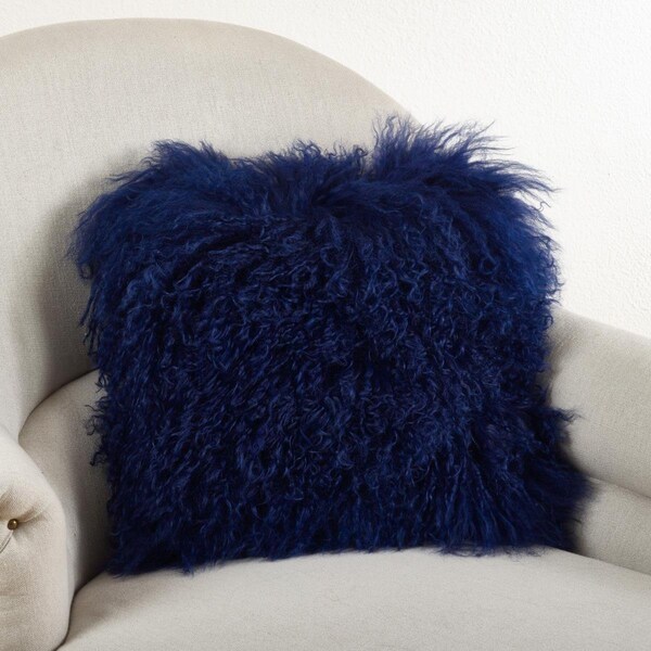 SARO 16 in. Square Wool Mongolian Lamb Fur Throw Pillow Cobalt Blue (Discontinued)