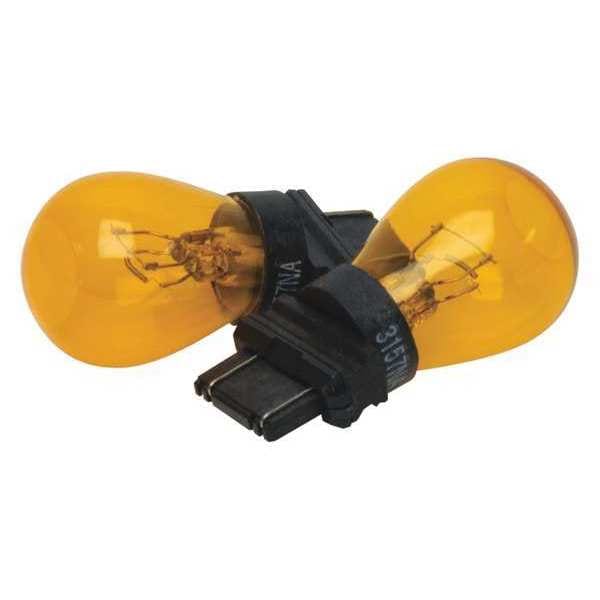 Incandescent Bulb, Bulb Base Type Plastic Wedge Double Filament (W2.5x16q), Bulb Shape S8, Bulb Finish Amber, Lumens 38/402, Trade Number 3157 NA, Voltage 14V AC, Watts 8.26 W, 26.88 W, Dimmable No