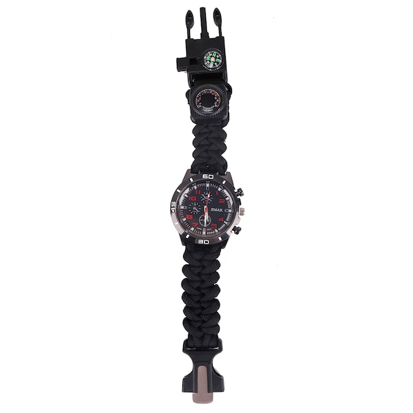 This watch provides piece of mind for anyone who loves to venture outdoors keeping lifesaving tools close. The glow in the dark watch hands allows for precise timekeeping the adjustable band is wrapped with 6.5 feet of survival paracord and houses a compass temperature gauge emergency whistle and a magnesium flint fire starter.