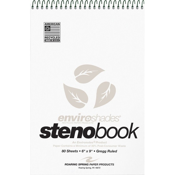Brighten up your desk with steno books containing gray paper. Smooth writing paper is Gregg-ruled with a center line in gray ink. Recycled paper contains post-consumer content. Covers are printed on a heavy-duty board to keep the paper inside protected. Wire ends are coil-locked for snag-proof performance.