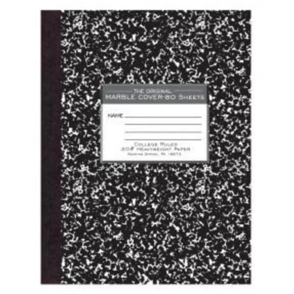 -24/case. -Binding: Black Tape. -Binding Edge: 10-1/8. -Construction: Center sewn and tape bound. -Cover Colors: Black marble. -Cover/Back Material: Stiff Printed board. -Paper: 20 tablet. -Paper Color: White. -Post-Consumer Recycled Content: 0. -Ruling: