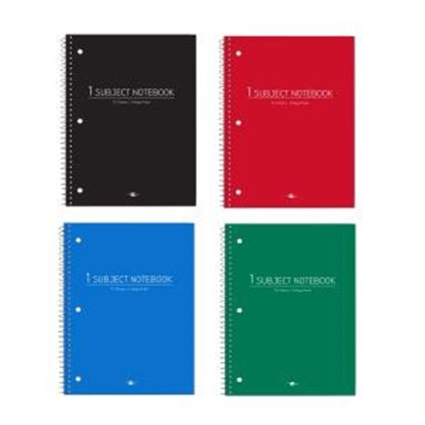 Features -College Ruled w/ margin -Sheet per book - 70 -Assorted Color Covers -Case of 24 -Back Material - Brown Kraft -Construction - Spiral bound -Cover Material - Poly -Cover Colors - Red Blue Black &Green -Paper Color - White -Item Size - 10.5 in. x 8 in.