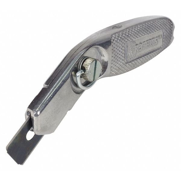 Carpet Knife, Blade Change Method Screw, Blade Material Carbon Steel, Blade Type Rounded Razor, Features Safety Guards, Handle Color Silver, Handle Material Aluminum, Handle Style Curved, Number of Blades Included 3, Overall Length 6 in, Overall Thickness 1 in, Overall Width 1 3/4 in