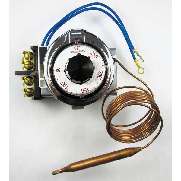 Electric Thermostat, Product Type Electric Thermostat, Capillary Tube Length 60 in, Sensing Bulb Diameter 3/8 in, Stem Length 7/8 in, Sensing Bulb Length 4 1/2 in, Compatible with Brand Chromalox, Consolidated Communications, General Electric, Johnstone Supply, OTM, Robertshaw, Uni-Line