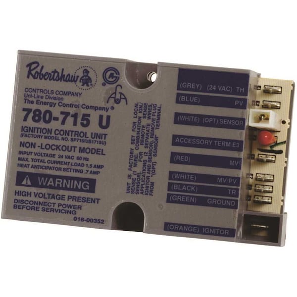 The Robertshaw 780 Series Pilot Controls feature flame rectification with solid-state logic and flame sensing to provide automatic sequencing that will ensure proper operation of an intermittent pilot ignition device. When the thermostat calls for heat, the 780 series control simultaneously initiates ignition sparking and opens the pilot valve portion of the gas valve. Pilot flame recognition stops ignition sparking and opens the main valve portion of the gas valve. Pilot burner flame is continuously monitored at a synchronous frequency for the duration of the heating cycle. Should the pilot flame fail during the heating cycle, the control will shut off the main valve until the pilot flame is established.Reduces truck stock inventory, saving space and moneyEasy-to-install with complete in-depth installation instructionsPilot and main valves draw 1 Amp at 0.5 power factorCombined load at 1.5 Amps at 0.4 power factor95% relative humidity noncondensing at 104 DegF