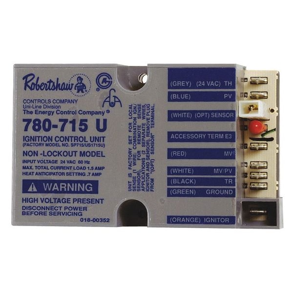 Ignition Control, Product Type Ignition Control, Maximum Operating Temperature 175 Degrees F, Minimum Operating Temperature -40 Degrees F, Lock Out Time Not Applicable, Pre-Purge Time 6 min, Number of Retries 3, Main Valve Current Output 1.5 A, Flame Sensor Current Output 0.7 mA, Ignition Cycle Time 90 seconds, Automatic Reset Time Not Applicable, Compatible with Series Universal