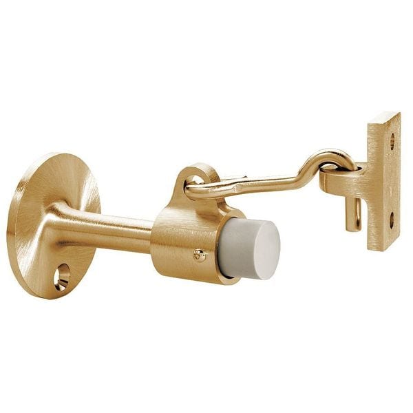 Hook-Style Door Holder, Base Dia. 2 1/4 in, Color Gold, Satin Bronze Finish, Material Solid Cast Brass, Projection 3 3/4 in, Height 1 3/4 in, Width 1 3/32 in, Mounting Type Wall-Mount, Tip Material Plastic, Hardware Included
