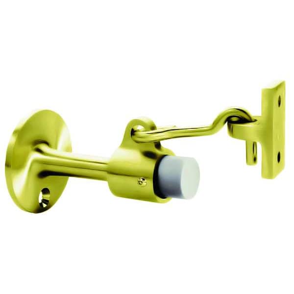 Hook-Style Door Holder, Base Dia. 2 1/4 in, Color Gold, Polished Brass Finish, Material Solid Cast Brass, Projection 3 3/4 in, Height 1 3/4 in, Width 1 3/32 in, Mounting Type Wall-Mount, Tip Material Plastic, Hardware Included