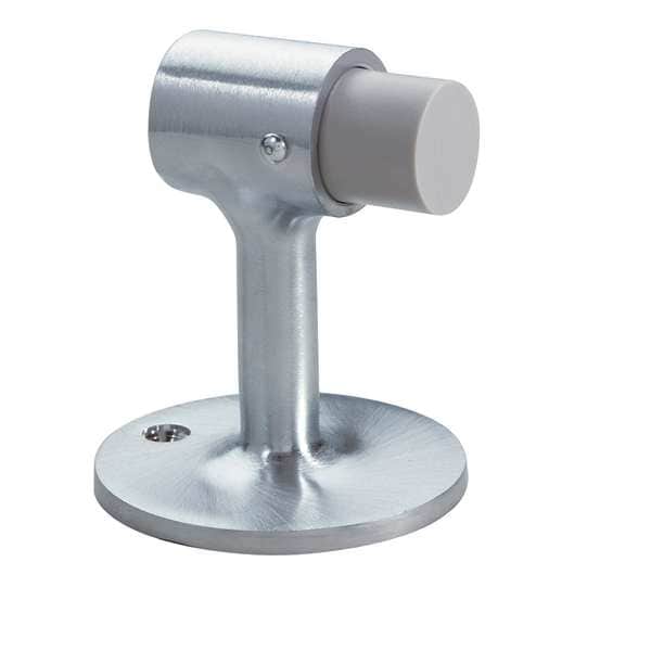 Door Stop, Mounting Type Screw In, Finish Satin Chrome, Base Dia. 2-1/2 in, Projection 5/8 in, Height 3 in, Mounting Style Screw-In, Material Cast Brass, Tip Material DuraFlex, Hardware Included