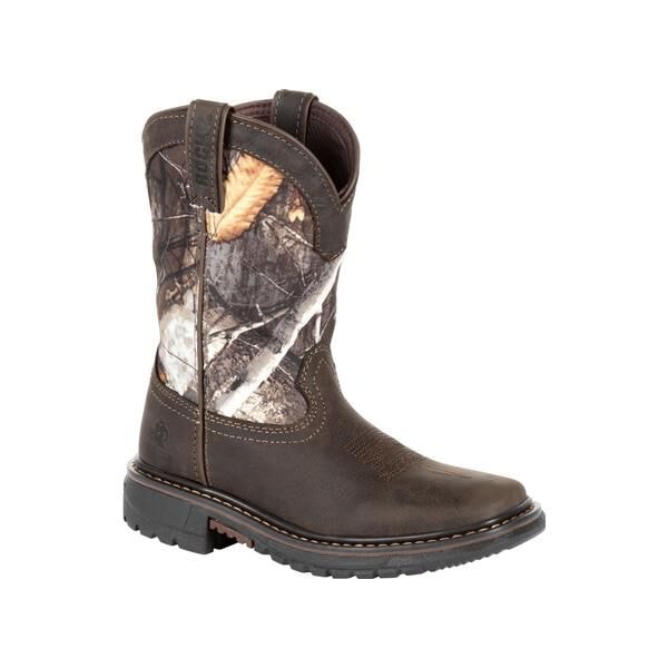 The Rocky Kids' Ride FLX eight-inch brown and Realtree Camouflage wellington featuring Rocky Waterproof is a great durable western boot for kids that like to go outside and play. Convenient pull straps and resilient material allows any kid to pull their boots on and go. Constructed with a light and flexible construction and padded cushioned insoles, these boots will be so comfortable, your child will never want to take them off. If you're looking for a reliable boot that will allow your kid to play in comfort all day long, this boot is exactly what you need.