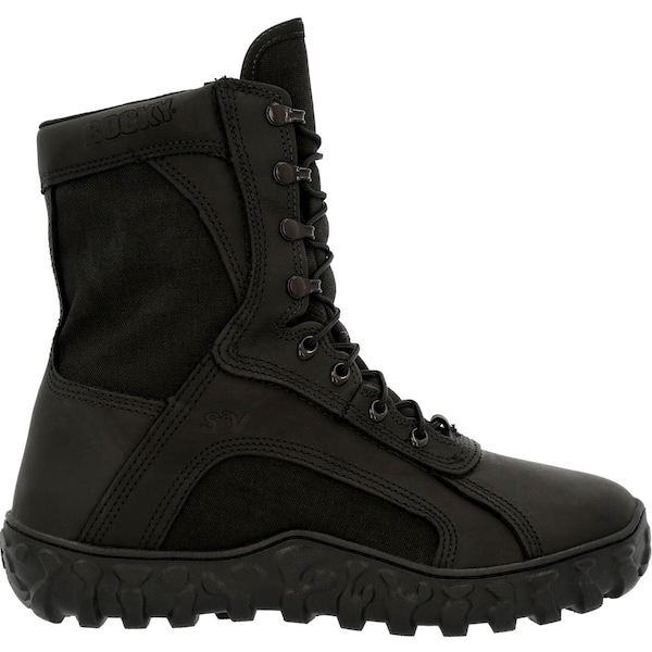 The Rocky S2V Military Boots are the ultimate combat boots. This footwear is the top choice for all military personal because they are built for quick maneuvers and fast paced action. The flash and water resistant leather is geared to protect your feet from quick flashes and rope burn. The boots also boast 1,000 Denier nylon technology in the sides and panels with a coating that serves as a flame retardant. These black boots can easily handle wet and cold conditions thanks to the addition of a Berry compliant components waterproof membrane, and 600 grams of thermal Insulation. To maximize comfort, the military boots also have triple stitched uppers and proprietary high walled Vibram soles, along with a perforated Air Port cushion footbed and PU midsoles. They are outfitted with an Aegis Microbe Shield to prevent bacteria and fungus growth. The Rocky S2V Military Boots are Berry Compliant. Eight inches in height.