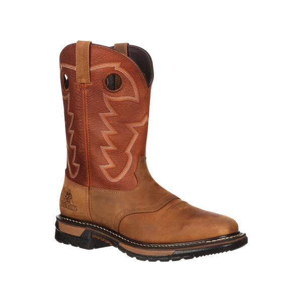 You can have great-looking waterproof western work boots that are comfortable. The Rocky Original Ride Western Boot is all about sole performance and interior comfort. These men's boots are designed with the eight-layer Rocky Original Ride performance system with dual-density oil-resistant and slip-resistant rubber outsoles. A right-angle heel and embedded safety grooves make the Rocky Ride outsole ideal for all work environments, including ladders and stirrups. These are waterproof boots made with the Rocky Waterproof System. Air flows in, but water stays out. Your feet stay dry. Guaranteed. The Rocky Original Ride is made with the perfect amount of protective features, comfort and sturdiness. Layers One and Two of the eight-layer system are the orthotic form and rear foot cradle. Layer Three is an upper enclosed cushion. The top layer is cushioned and perforated. After wearing your work boots for a while, this layer forms to the contours of your foot. Layer Four is a welt innersole with a Flex Facilitator. This gives your boots super flexibility. Next, there's the full-length EVA midsole. That's Layer Five. It absorbs shock, but is really lightweight. Layer Six is the double-ribbed tempered steel shank. It provides stability and extends the life of the boots. Layer Seven is the forefoot propulsion pad and rear foot landing pad. This is a unique two-part highly-cushioned system that increases three things: shock absorption, flexibility and comfort. Finally, check out Layer Eight. The Rocky Ride Outsole is a rubber work platform outsole that is oil-resistant and provides secure footing. The forefoot and rear section have a softer density to give you sure-footed traction. These 11-inch men's western work boots have full-grain leather uppers. The foot is tan paired with an ochre shaft that features stitching detail. The boot has both pull straps and pull loops, as well as a great western square toe.