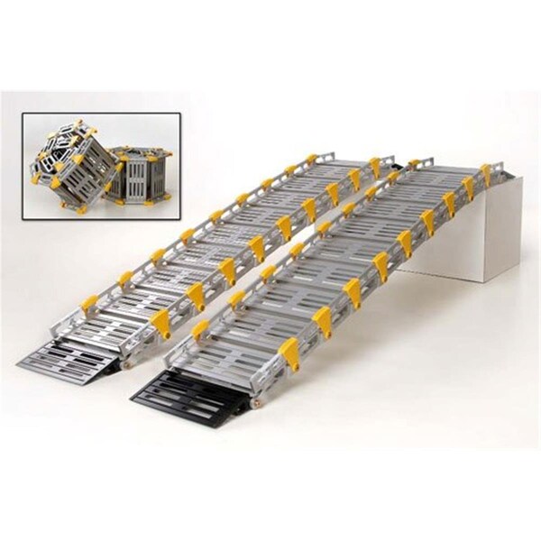 9 ft long by 12 in wide twin track Roll-A-Ramp. Create entry ramps to homes vehicles or offices. Then roll it up and put it away. Great for use on 2-3 steps. Versatile ramp design uses two bolts to connect each section allowing you to add or subtract length as needed. Has a cambered section for easy on and off at the top of the ramp. Lightweight extruded aluminum construction with anodized surface and built-in safety rails. Holds up to 2000 lbs per pair.Lead time: 4-6 weeks
