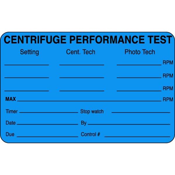 Label, Horizontal Rectangle, Number of Printed Sides 1, English, Sign Legend Centrifuge Performance Test, Sign Legend Background Color Blue, Sign Legend Style Text, Package Quantity 1000