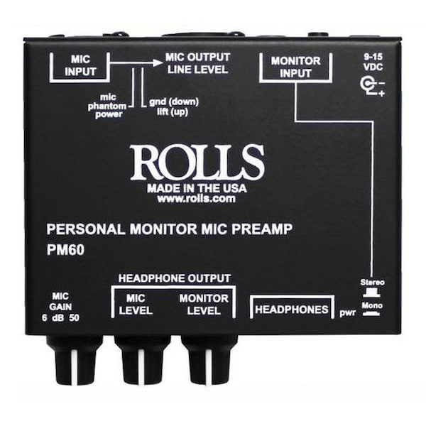 All in one Personal Monitor headphone amp with a fully functional Microphone Preamp built in. Now there is a way to have a personal monitor without the need for a dedicated mixer board with a mic preamp and microphone phantom power. The PM60 has all those features built in. The PM60 has many uses other than personal monitoring, it can be used as a stand-alone mic preamp with headphone monitoring, it can be used as a mic monitoring headphone amp for direct recording, and it can also be used as a two channel mixer with stereo line 1/4-in or 1/8-in out. It is perfect for podcasting, home recording, mixing, boom mic monitoring for camera recording and mixing, or as a stand-alone personal monitor. The PM60 is an all in one unit that has many capabilities. Made with an all steel chassis, the PM60 is built to last.* Gain: 10dB 1/4-in or 1/8-in, 48 dB XLR -inmic-in* Input Impedance: 600 Ohms XLR, 22K 1/4-in or 1/8-in line* Output Impedance: 10 Ohms Headphone* Frequency Response: 3Hz to 100kHz* THD: .05% at 1kHz* S/N Ratio: 90 dB* PWR: 9-15 VDC* Size: 4-in x 3.25-in x 1.6-in* Weight: 1.1 lbs* Indicator: 1 Power LED 1/4-in and 1/8-in Headphone Outputs* Ground Lift on XLR Mic* Mono or Stereo 1/4-in or 1/8-in Monitor Input* Individual Level controls* Included PS27s power
