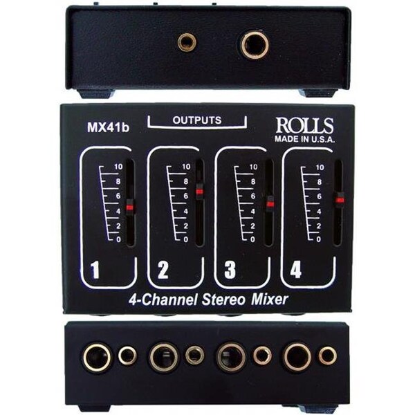 The MX41b is a stereo four channel passive mixer for expanding a console mixer, mixing instruments, CD players, cassette players, computers etc. It requires no batteries or other power source. The unit may also be used as a 1 In 4 Out stereo splitter box when all controls are set to maximum.