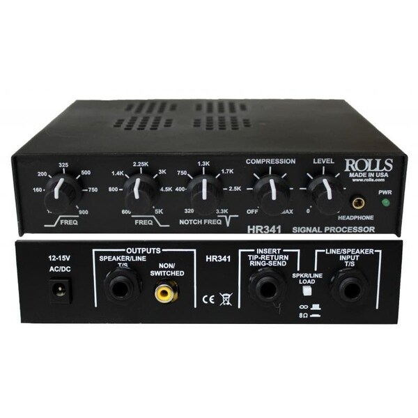 Rolls HR341 voice band audio processor. The is a completely analog unit, not a clock in it. It has an instert point for taking bandwidth control of a single microphone or a group if your mixer will allow. The 24dB/oct shelving filters can be set to minimize noise and limit the voice bandwidth. The notch filter can eliminate an annoying feedback fundamental The headphone jack can cut the speaker out, but not the unswitched out. The compressor is a soft knee optical type and help smooth out loud signals transparently. This is ideal in the insert of a mixer for complete control of a microphone. For bandwidth and dynamics control as well as some feedback suppression. The built in power amp is about 2 watts and will drive most speakers. The speaker load switch on the rear is for loading tube type amps that hate not having a speaker load on their output, or on a solid state unit you can switch it off. T/S means tip sleeve. This comes with a transformer type A/C adapter not shown so no noise from that. Rolls half rack or with adapter standard half rack 120 - 900 Hz high pass filter 600 - 5000 Hz Low pass filter 320 - 3300 Hz 30dB 0.1 oct notch filter 10:1 soft knee optical compressor Power amp 2W RMS 4 ohm or higher Power 12 - 18 V AC/DC 500ma or more Rolls half rack size Works with pretty much any adapter 12 to 15v Simple smooth operation level before amp so it can handle pretty much any level Great Acoustic Guitar processor Great Mic processor Takes complete control of a mixer channel