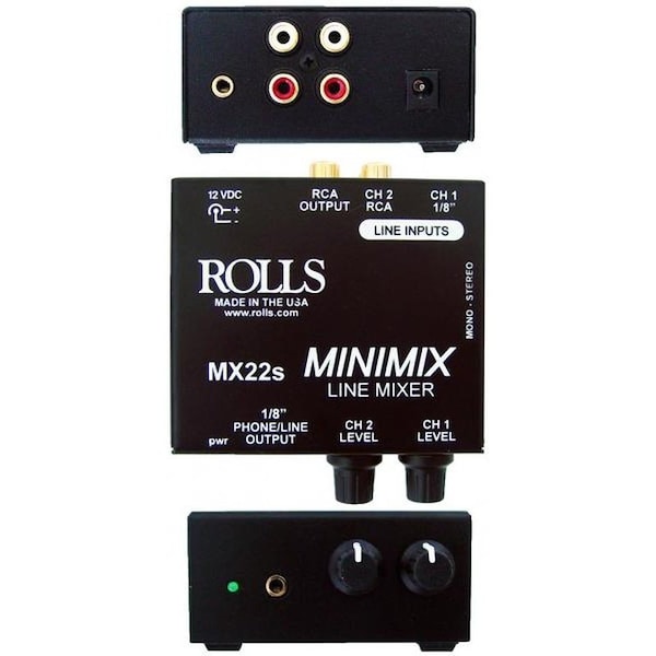 The MX22s is a 2 Channel mixer for mixing a 1/8-in line signal such as a laptop computer or Ipod, & a stereo RCA signal such as a CD player. The MX22s has enough output to drive a power amplifier directly, & is ideal for audio visual & aerobics studio applications. The MX22s can be configured as either Stereo default or Mono, by moving a shorting jumper on the PCB. Power adapter is included.1/8 & RCA line level signalsDual RCA Stereo outputIndividual controls for each channelCH1 Max Gain: 32 dBCH2 Max Gain: 20 dBCH1 Input Impedance: 10 OhmsCHI Input Impedance: 20K OhmsOutput Impedance: 50 OhmsPower: 12 VDC 100 mASize: 2.75-in x 2.35-in x 1.5-in 7 x 6 x 3.8cmWeight: 1 lb