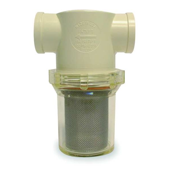 Inline Strainer, Material Nylon, Connection Type NPT, Bowl Color Clear, Pipe Size 1 1/4 in, Maximum Pressure at 100 deg F 100 psi @ 125 Degrees F, Length 5 in, Height 7 1/8 in, Screen Material 304 Stainless Steel, Gasket Material EPDM, Application Agricultural Sprayers, Car Wash, Drinking Water Prefilters, Floor Scrubbers, Medical, Pressure Washers, Color White, Connection Gender Female, Connection Size 1 1/4 in, Diameter 4 15/16 in, Flow Rate 14.5 gpm, For Use With Water
