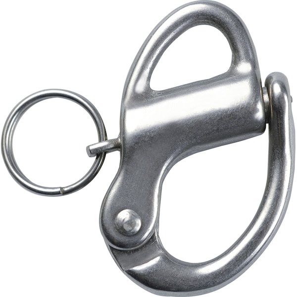 Snap Shackle - Fixed Eye - 32mm(1-1/4") Length. Heavy duty plunger springs and precision components ensure dependable service. Body and hasp profiles are designed for easy clearance of lines and fittings when released. High strength to weight ratio. Split ring on plunger pin is spot welded for security. A lanyard can be attached to the plunger pin for easy opening., Materials: Grade 15-5PH investment cast stainless steel body and hasp, Grade 316 stainless steel plunger pin and spring.