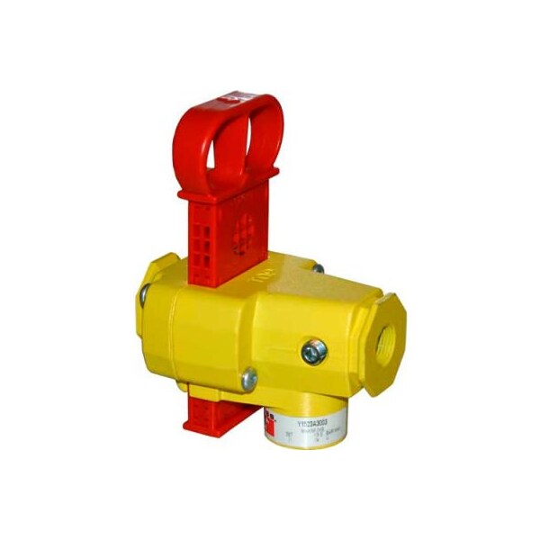 Ross modular lockout valve, yd1523a3003, 3/8" bspp, avg cv 5.5, 15-200 psig meets all osha, ansi, csa, and iso requirements for lock out and tag out procedures. Valves are highly visible with yellow body and red operating handle, provides rapid exhaust, have an integrated sensing port for pressure verification, and can be assembled with other ross md4 frl components.