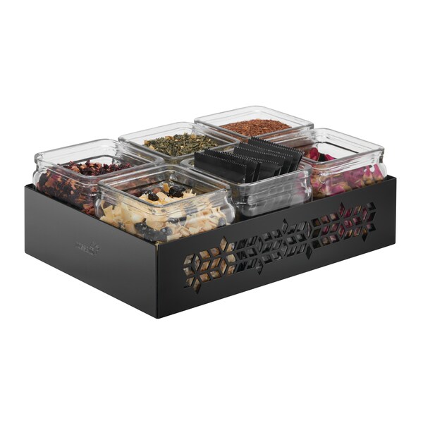 Enchant your guests with the elegant mystery of the Mosaic Collection. This black matte tabletop holder can accomadate 6 glass jars that fit in like a puzzle. Can be used for condiments or cutlery.