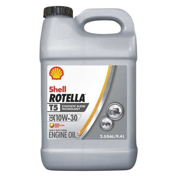 Engine Oil, Series RotellaT5, Container Size 2.5 gal, Standards API, Color Amber, Container Type Bottle, Flash Point 437 Degrees F, ISO Viscosity Grade 32, Pour Point -44 Degrees F, Specific Gravity 0.847 at 15.6 Degrees C, Viscosity Index 147