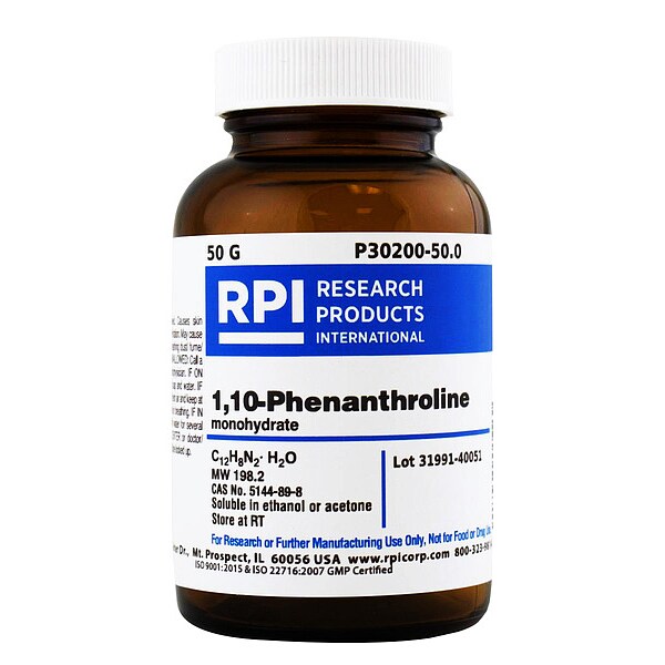 1, 10-Phenanthroline, monohydrate, Container Size 50 g, Solubility Ethanol and Acetone, Form Powder, Container Material Glass, Storage Temp. Room Temperature, Shelf Life 18 mo