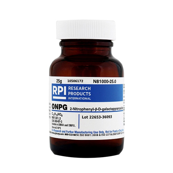 2-Nitrophenyl-B-D-galactopyranoside, CAS Number 369-07-3, Purity Greater Than 95 Percent, Container Size 25 g, Form Powder, Molecular Weight 301.3, Solubility Water, Storage Temp. 2 Degrees to 8 Degrees C, Chemical Formula C12H15NO8, Shelf Life 18 mo