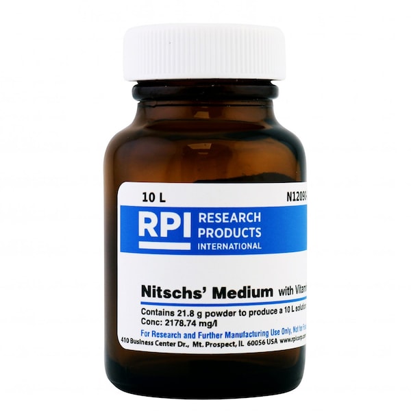 Basal salt mixture containing micro and macro elements with vitamins as described by Nitsch & Nitsch 1969.Solubility: WaterStorage Temperature: Room TemperatureStorage Conditions: Room TemperatureAppearance: White Powder Potassium Nitrate: 950.00 mg/lAmmonium Nitrate: 720.00 mg/lPotassium Dihydrogen Phosphate: 68.00 mg/lMagnesium Sulfate Anhydrous: 90.27 mg/lNitsch Micro Elements: 75.92 mg/lNitsch Vitamin Mixture: 108.55 mg/lCalcium Chloride Anhydrous: 166.00 mg/lShipping Weight: 0.19 lbsShipping Dimensions: 1.63 x 3.00 x 1.63Research or further manufacturing use only, not for food or drug use.