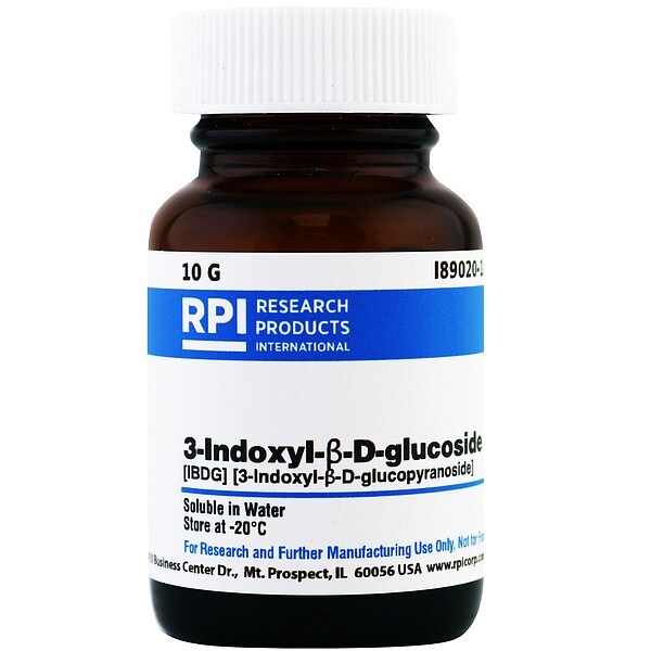 3-Indoxyl-B-D-glucoside (IBDG), CAS Number 487-60-5, Purity Greater Than 95 Percent, Container Size 10 g, Form Powder, Molecular Weight 295.29, Solubility Water, Storage Temp. 2 Degrees to 8 Degrees C, Chemical Formula C14H17NO6, Shelf Life 18 mo