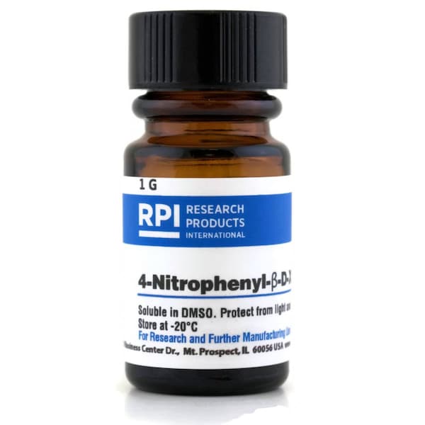 Free PNP: <50ppmCAS Number: 2001-96-9Molecular Weight: 271.2Chemical Formula: C11H13NO7Solubility: DMSOStorage Temperature: -20CStorage Conditions: FreezerAppearance: White to off white powder Identity: FTIR concordant p-Nitrophenol: 50 ppmPurity TLC: 98 %Solution Test 0.4% in H2O: Clear, colorless to v.pale yellow Solution Test 1% in MeOH: Clear, colorless to v. pale yellow Specific Rotation: -57.0 - -53.0 Water Content K.F: 0.25 %Shipping Weight: 0.0399 lbsShipping Dimensions: 1.25 x 1.75 x 1.25Research or further manufacturing use only, not for food or drug use.