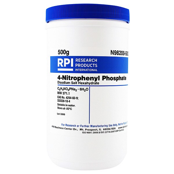 4-Nitrophenyl Phosphate Disodium Salt Hexahydrate, CAS Number 333338-18-4, Purity Greater Than 95 Percent, Container Size 500 g, Form Powder, Molecular Weight 371.1, Solubility Water, Storage Temp. 2 Degrees to 8 Degrees C, Chemical Formula C6H4NNa2O6P, 6H2O, Shelf Life 18 mo
