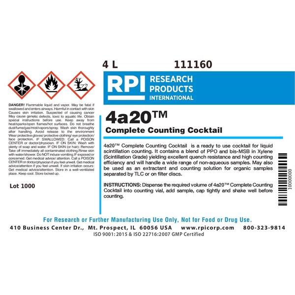 Complete Counting Cocktail 4a20 is a ready to use cocktail for liquid scintillation counting. It contains a blend of PPO and bis-MSB in Xylene Scintillation Grade yielding excellent quench resistance and high counting efficiency and will handle a wide range of non-aqueous samples. May also be used as an extractant and counting solution for organic samples separated by TLC or on filter discs.Appearance: Bluish Tint Liquid Insoluble Matter: None Visually Odor: Distinct Xylene Odor Shipping Weight: 7.9999 lbsShipping Dimensions: 7.00 x 12.00 x 4.50Research or further manufacturing use only, not for food or drug use.