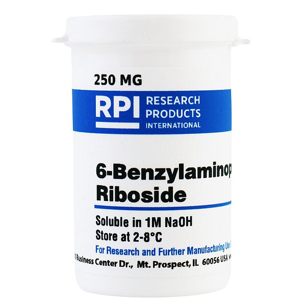 6-Benzylaminopurine Riboside, CAS Number 4294-16-0, Purity Greater Than 95 Percent, Container Size 250 mg, Form Powder, Molecular Weight 357.4, Solubility 1M NaOH, Storage Temp. 2 Degrees to 8 Degrees C, Chemical Formula C17H19N5O4, Shelf Life 18 mo