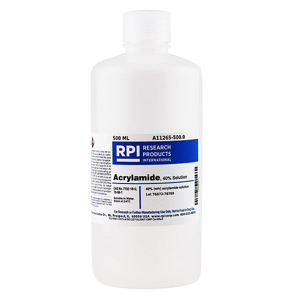 Acrylamide, 40 Percent Solution, Purity Greater Than 95 Percent, Container Size 500 mL, Form Powder, Storage Temp. Room Temperature, Shelf Life 18 mo