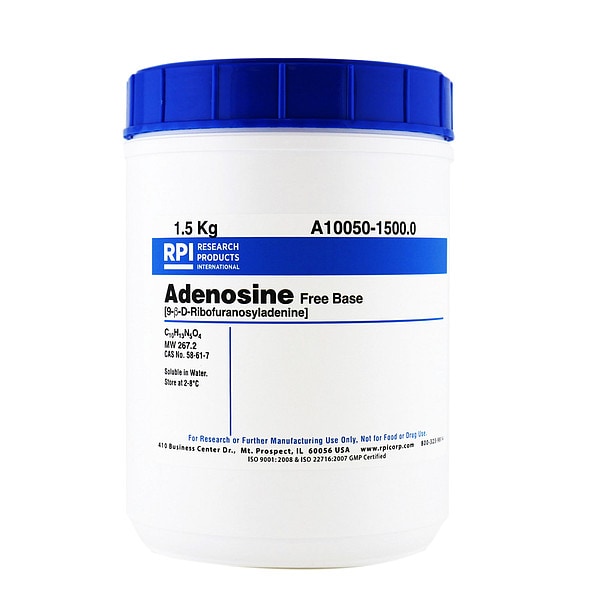 Adenosine/Free Base, CAS Number 58-61-7, Purity Greater Than 95 Percent, Container Size 1.5 kg, Form Powder, Molecular Weight 267.2, Solubility Water, Storage Temp. 2 Degrees to 8 Degrees C, Chemical Formula C10H13N5O4, Shelf Life 18 mo