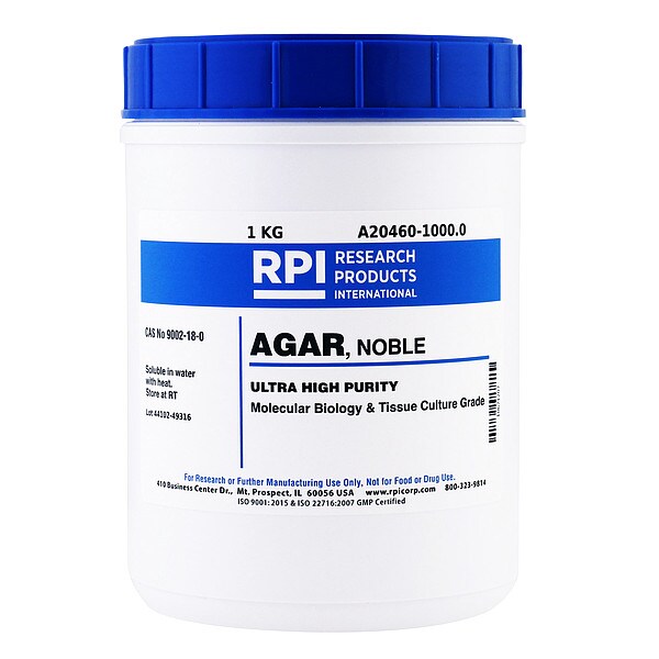 Agar - Noble, CAS Number 9002-18-0, Chemical Formula C14H24O9, Chemical Grade Lab, Shelf Life 18 mo, Special Information Noble, pH (1.5 Percent solution): 5.5 to 7.2