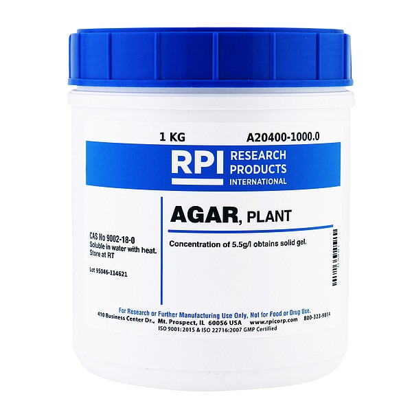 Agar - Plant, CAS Number 9002-18-0, Chemical Formula C14H24O9, Chemical Grade Lab, Shelf Life 18 mo, Special Information Plant