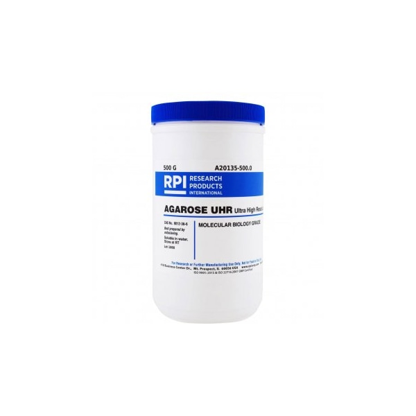 For DNA/RNA fragments 5-500bp. Ideal for primer size. DNAse and RNase free at 3% concentration, Agarose Ultra High Resolution (UHR) presents a resolution of DNA fragments similar to gels made with polyacrylamide at concentrations of 8%. Gels with Agarose UHR are easier to prepare and are absolutely free of neurotoxic dangers inherent to polyacrylamide. While Agarose UHR can be dissolved by careful adherence to microwaving procedures, Agarose UHR gels are best prepared by autoclaving.