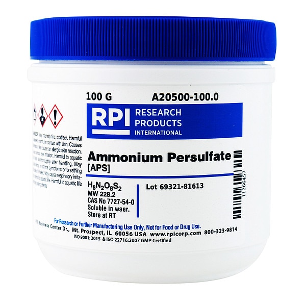 Ammonium Persulfate, CAS Number 7727-54-0, Molecular Weight 228.2, Chemical Formula H8N2O8S2, Chemical Grade Lab, Shelf Life 18 mo, Special Information BSE/TSE Free