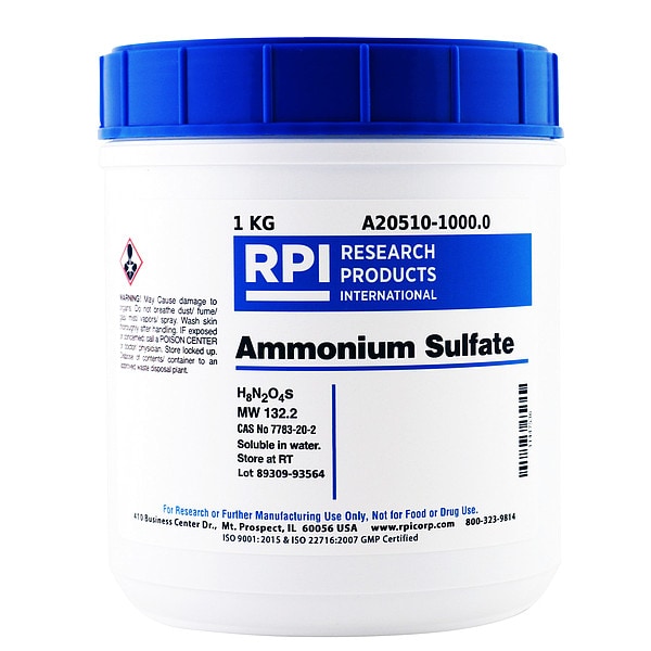 Ammonium Sulfate, CAS Number 7783-20-2, Molecular Weight 132.2, Chemical Formula H8N2O4S, Chemical Grade Lab, Chemical Family Type Reagent, Shelf Life 18 mo, Special Information BSE/TSE Free