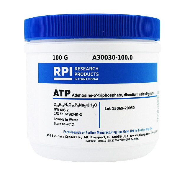 ATP (Adenosine-5-triphosphate, Disodium Salt Trihydrate), Container Size 100 g, Solubility Water, Form Powder, Container Material Plastic, Storage Temp. -20 Degrees C, Shelf Life 18 mo