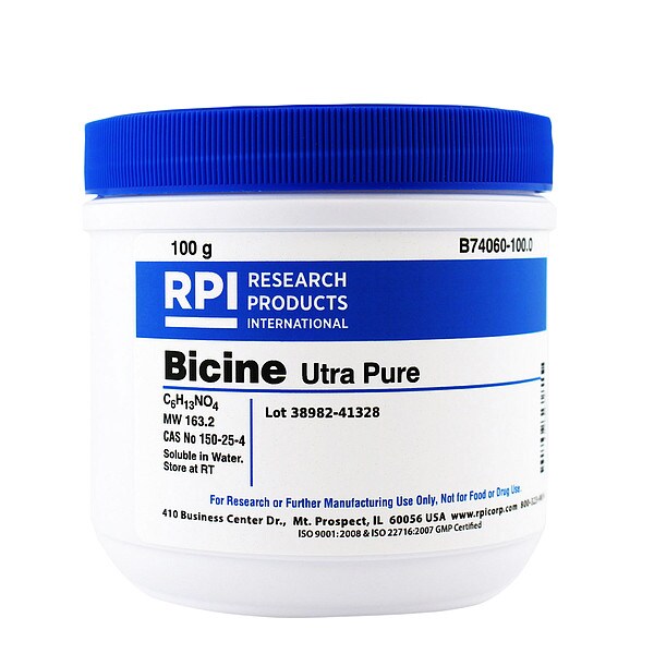 Bicine Ultra-Pure, Concentration B74060, CAS Number 150-25-4, Molecular Weight 163.2, Chemical Formula C6H13NO4, Chemical Container Size 100 g, Chemical Family Type Buffers, Shelf Life 18 mo
